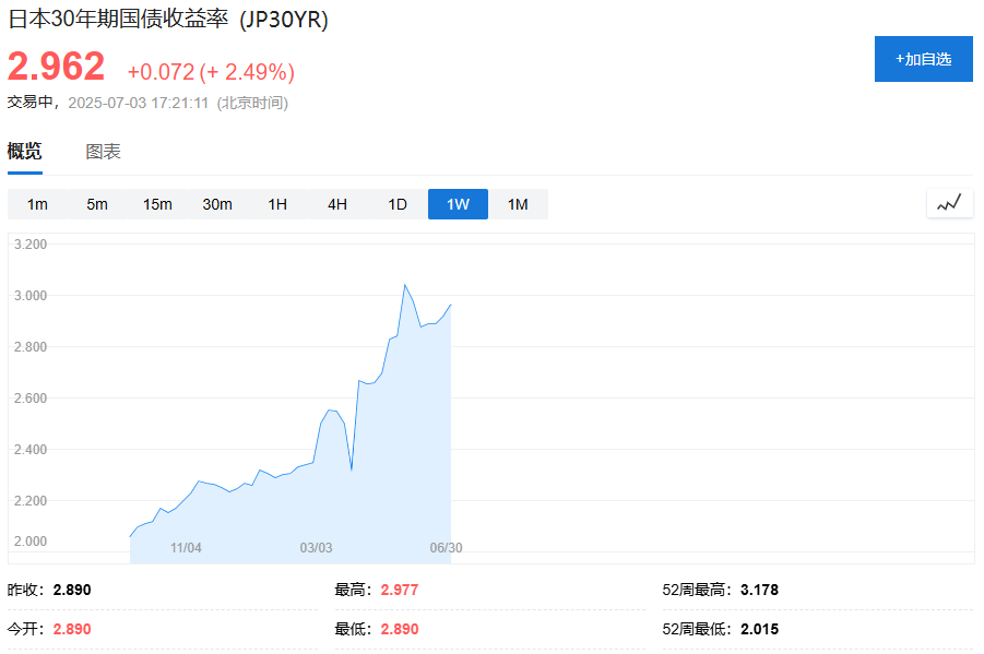 虽然拍卖有买家接手,日本30年期国债的市场收益率当天还是大涨超7个基点,达2.962%,40年期也涨到3.125%,日本国债收益率曲线全线上升。换句话说,政府要借同样的钱,需要付出更高的利率成本。
